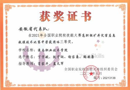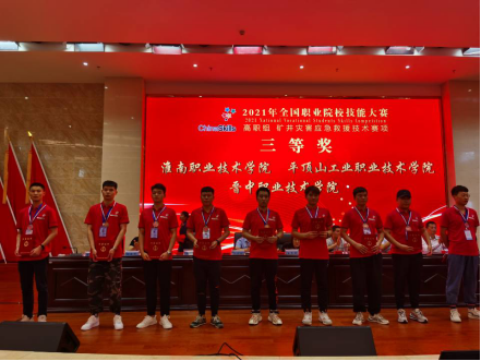 来自全国各省(市)、自治区的21支代表队的84名选手参加现场角逐。各参赛队在赛场上比拼技能、展示风采、增进友谊,彰显了新时代职业技术人才的精神风貌。经过激烈的角逐,由我院丁宇航、阮守润、谢家豪、陶安康四名学子组成的安徽省代表队,勇夺2021年全国职业院校技能大赛高职组“矿井灾害应急救援技术”赛项团体三等奖,综合排名列全国第七。