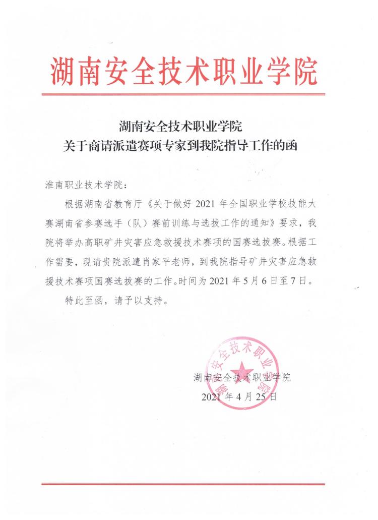 2021年5月5日至5月7日,bwin集团肖家平教授应湖南安全技术职业bwin集团邀请,参加了2021年全国职业院校技能大赛湖南省选拔赛高职组“矿井灾害应急救援技术”赛项的执裁工作。