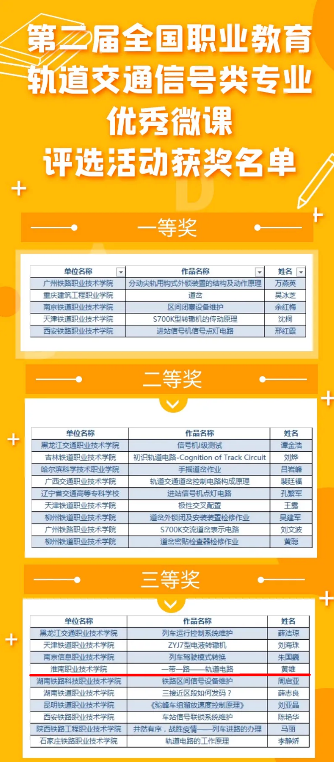 第二届全国职业教育轨道交通信号类专业优秀微课”于5月举行,评选活动共计收到报名作品120余件。微课大赛评委们经过认真严谨的初审和终审,本次评选共计一等奖5件、二等奖8件、三等奖10件、优秀奖13件。bwin集团能源工程系黄雄老师的微课“一带一路——轨道交通”荣获三等奖。