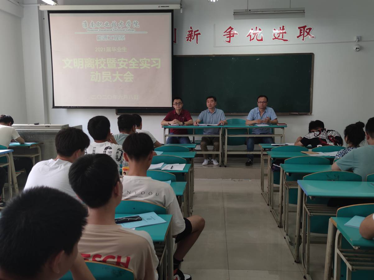 2019年6月8日下午,能源工程系在1206教室召开2021届毕业生文明离校暨安全实习动员大会,2018级全体员工参加会议。系主任孙泽宏、主任秘书曹祺、副主任秘书杨波出席了会议,会议由主任秘书曹祺主持。