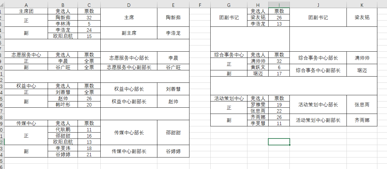 随即进入了本次大会的高潮,参与竞选的人员做竞选演讲。他们分别在自己对员工会的认识,以及在过去工作中取得的优异成绩,对未来工作的展望等方面做出激情的演讲。演讲过后,秉承民主公正公 平的原则,由员工会现任干部及大一大 二各班班长和团支书组成的评审团对竞 选人员进行了无记名投票。最终选举出了新一届的员工会成员: